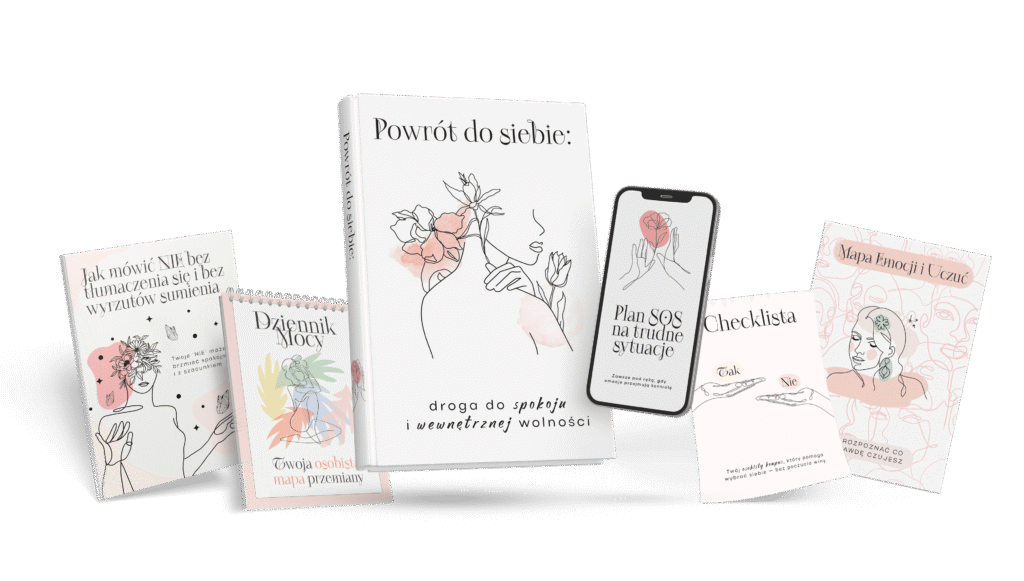 Kupując ebook „Powrót do Siebie” otrzymujesz nie tylko ponad 100 stron praktyki, wiedzy i narzędzi, ale również 5 dodatkowych krótkich eBooków, które wprowadzą Cię głębiej w codzienną pracę nad sobą i wzmocnią efekty Twojej przemiany: